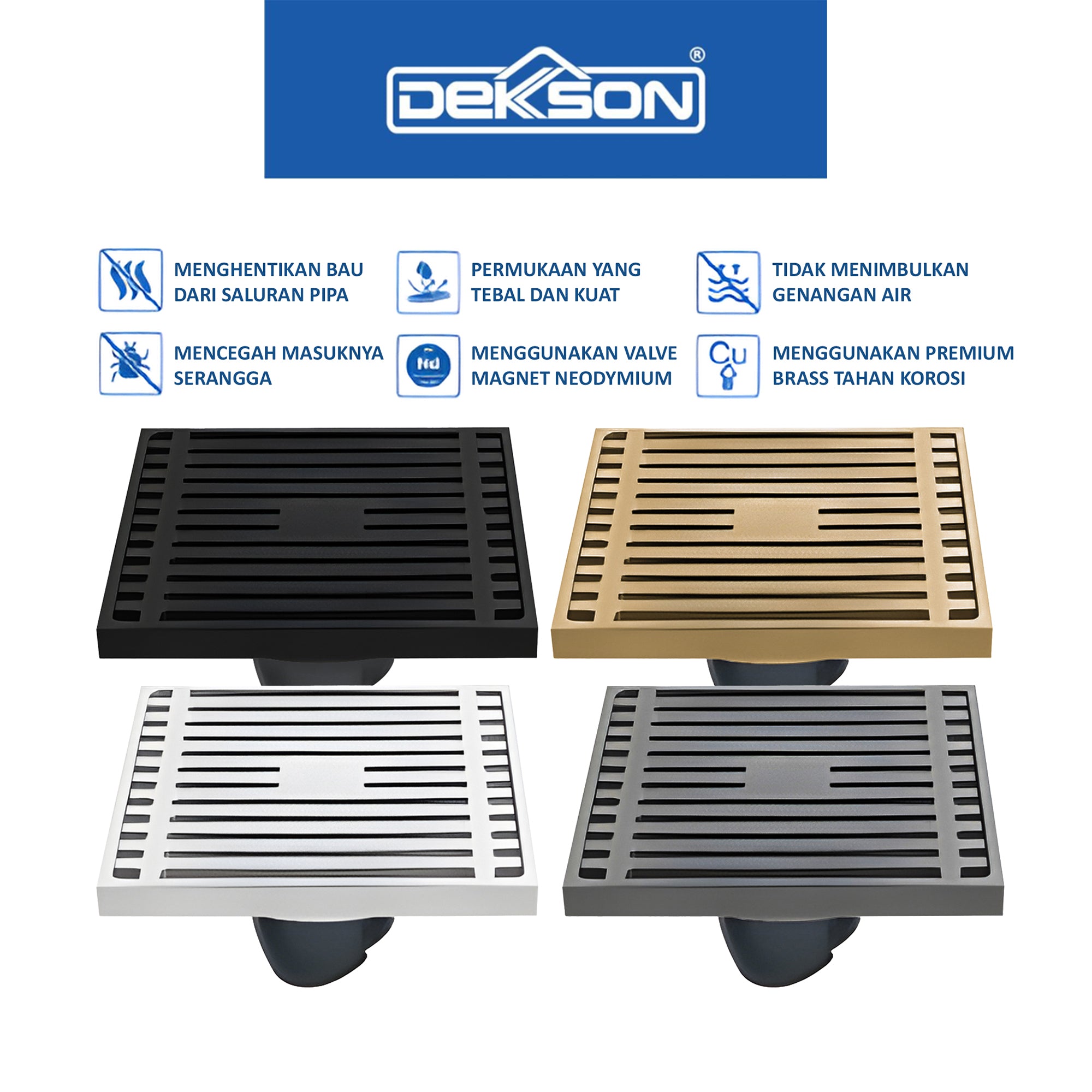 Floor Drain Dekkson FD 9907 BR CP SN GUN GREY MB PB Saringan Drainase Lantai Floor Drain 4 Inch Brass Black Gold Grey Silver